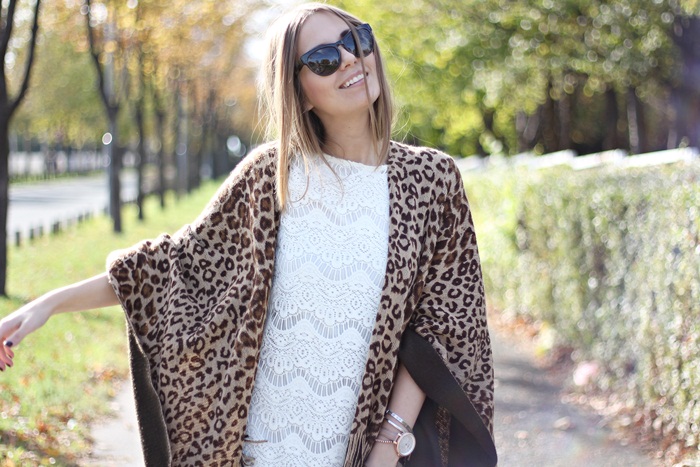 In this look, i paired Fossil watch and bracelets with leopard poncho, lace dress and suede boots.